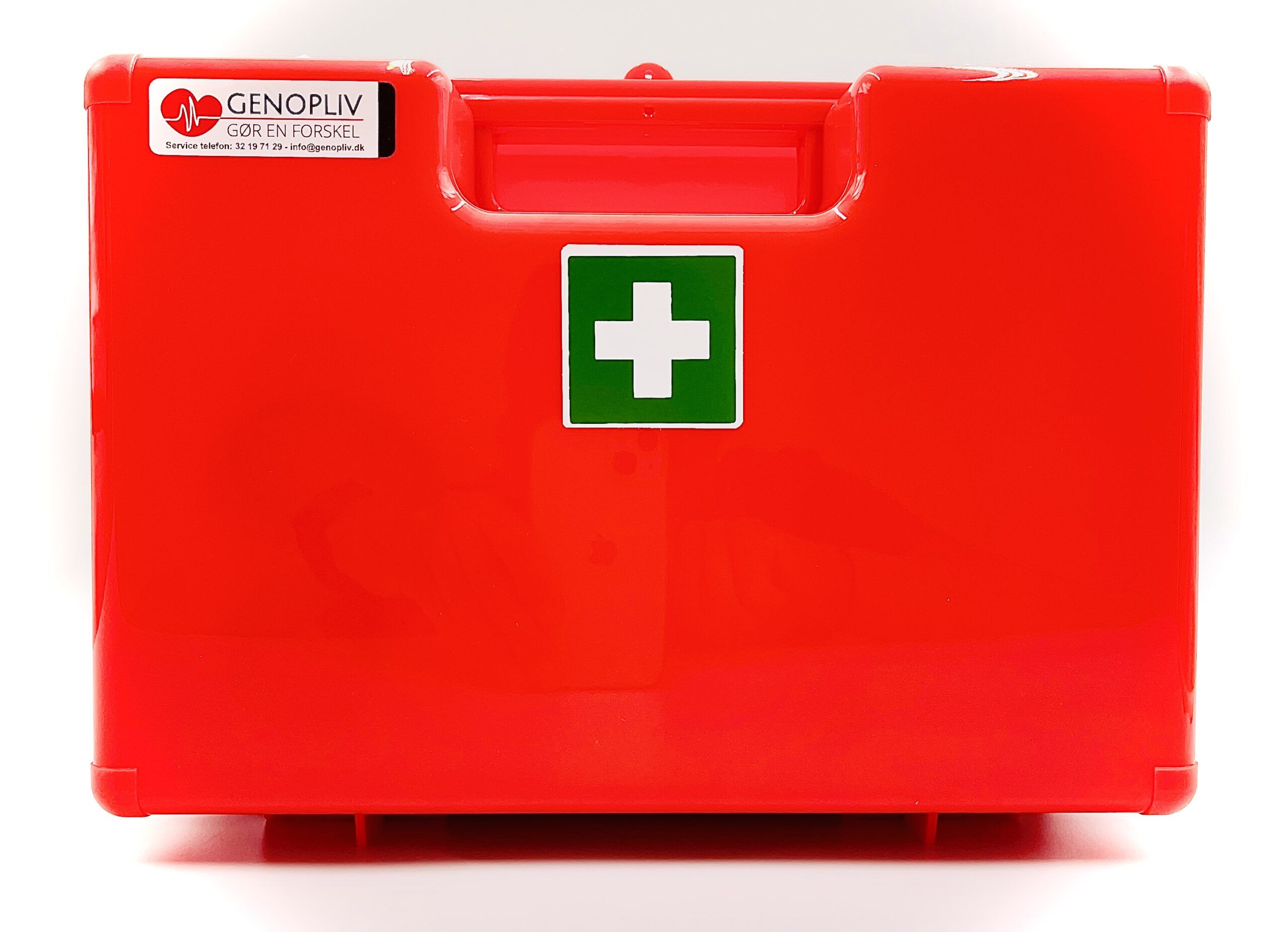Selve førstehjælpskassen er en kraftig støvtæt plastkuffert med vægophæng. Førstehjælpskassen kan betjenes hængende fra væg.